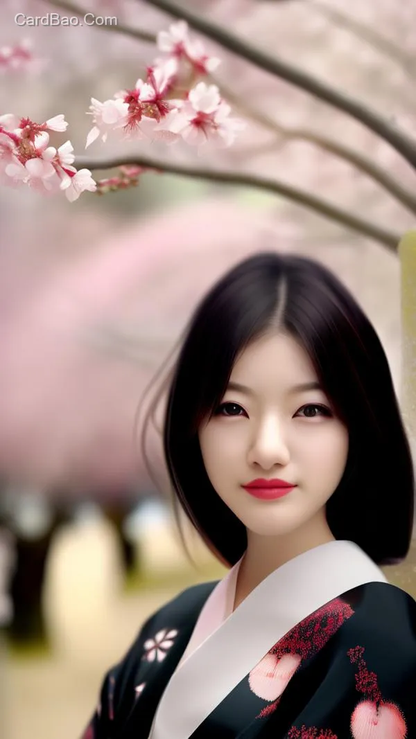 大头照,穿着黑色和服,和服上有樱花,背景有樱花树,8k