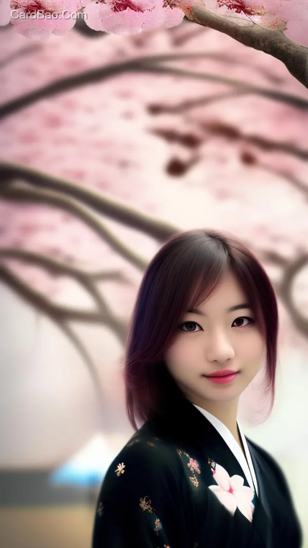 大头照,穿着黑色和服,和服上有樱花,背景有樱花树,8k
