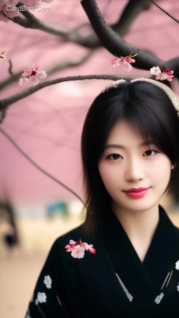 A headshot portrait, wearing a black kimono with cherry blossom patterns, set against a background of cherry blossom trees, in 8K resolution.