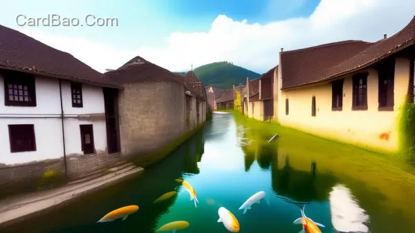 In the ancient village's river channel, the water is crystal clear, teeming with beautiful carp that swim freely and leisurely.