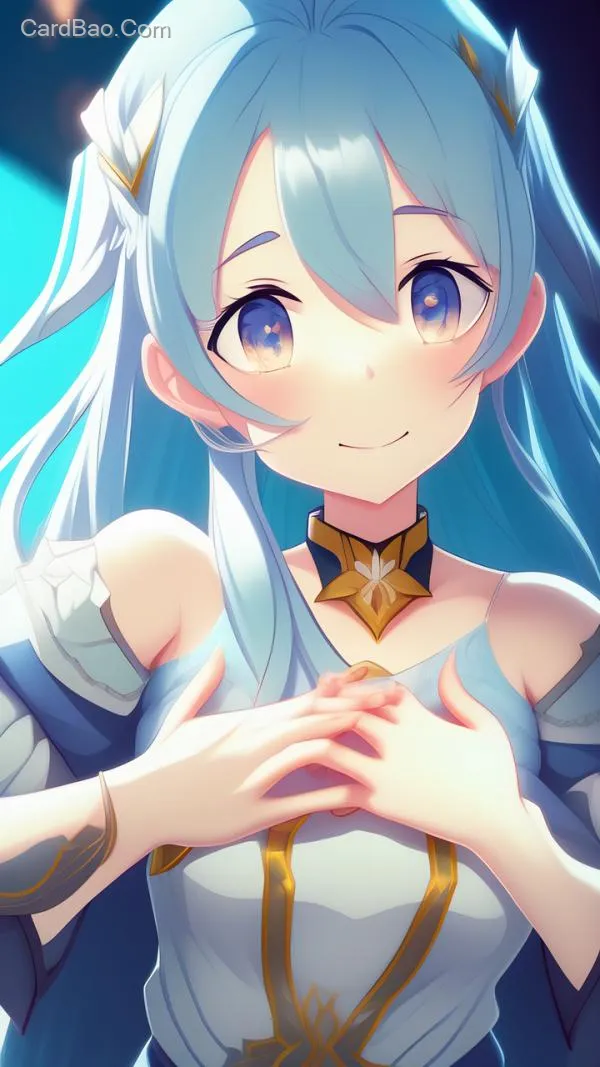 美少女,7的手势,右手横在胸前向右指,淡蓝色头发,基础图的人物,叠加图的动作