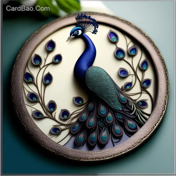 A circular precious metal ornament featuring the front pattern of a peacock spreading its tail, crafted using embroidery techniques, with bright and vibrant colors, showcasing intricate details through its undulating texture.