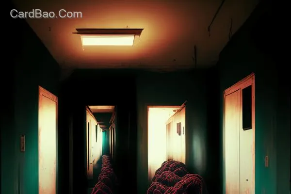 A long, pitch-black, dilapidated corridor of a residential building stretches in both directions. There are no windows or lights along the hallway, making the two narrow passages resemble the throat of a monster, with no end in sight. The ceiling is low, only two meters high. Inside the corridor, a rain of teeth is falling, and bloodstains are scattered on the floor. The color palette is dominated by blue-green tones, creating a dark fantasy and post-apocalyptic atmosphere. The view is frontal, rendered in a realistic style.