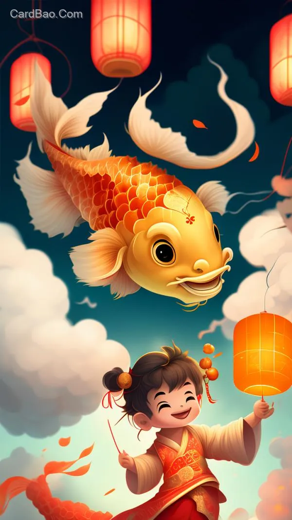Auspicious Year of the Dragon, a golden koi from Chinese New Year paintings swims freely among the clouds. A cute little boy prays for a happy new year, celebrating the festive atmosphere with lanterns and red envelopes.