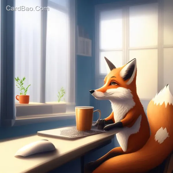 A cute fox is sitting in front of a computer working. There is a window on the upper left side, a bookshelf in the background, and flowers and a cake on the desk in front, along with coffee.