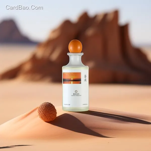 A piece of wood supports the product against a beautiful desert background.