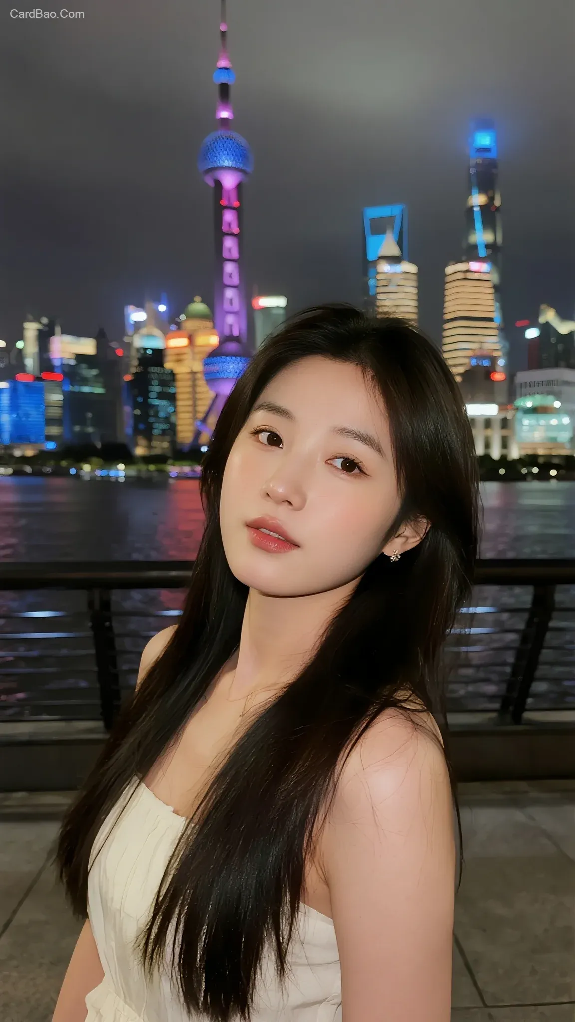 In the corridor of the Pudong Art Museum, a beautiful girl with large double-lidded eyes and long hair, wearing exquisite makeup, leans naturally against the railing. Her gaze is fixed on the left front, with the night view of the Huangpu River across the way as the backdrop. The Huangpu River, the Oriental Pearl Tower, and various skyscrapers are illuminated by the dazzling lights as evening falls.