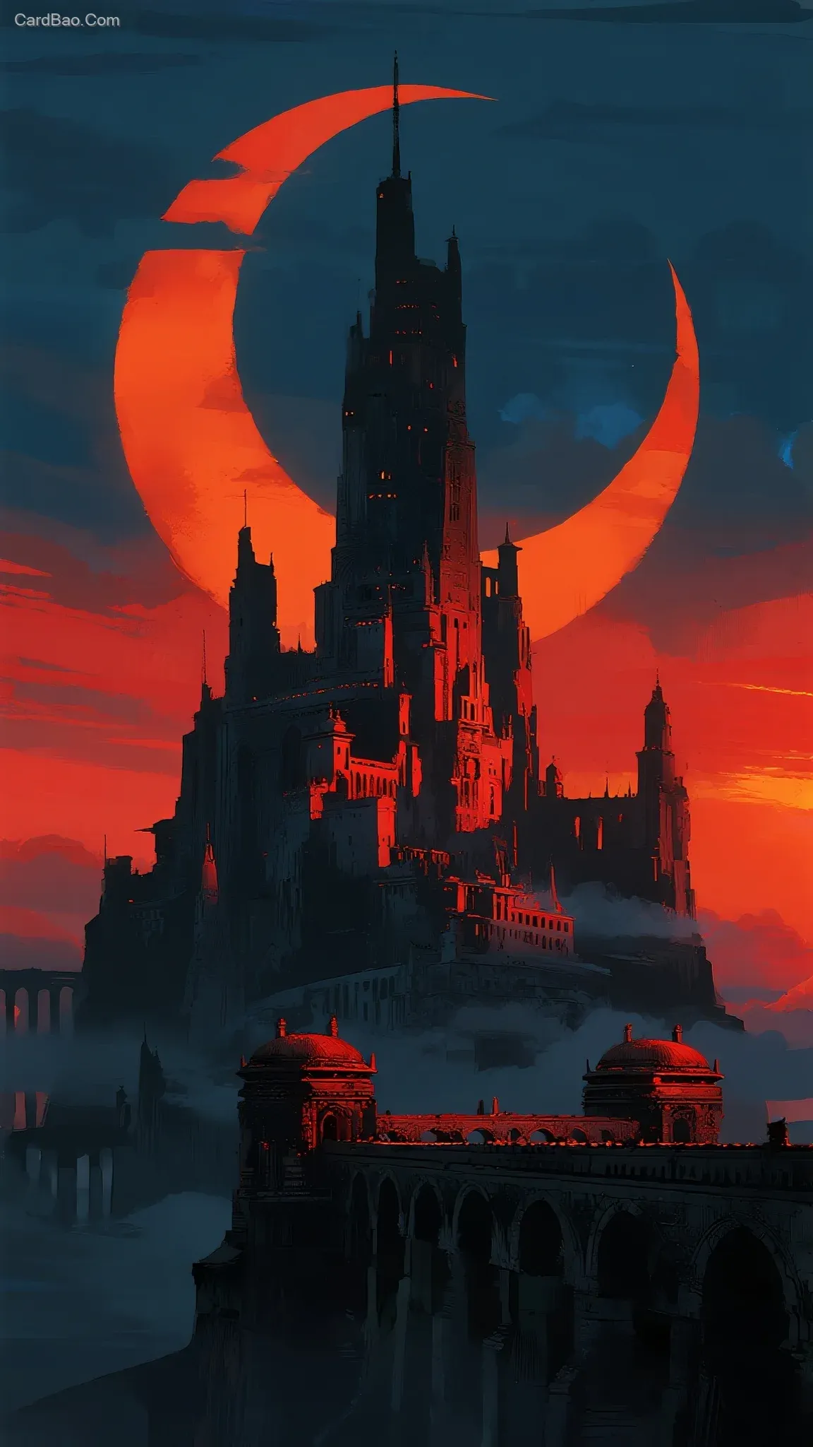 莫比斯风格的黑色弯月之城,巨大的规模,红色余晖,深蓝色阴影,异类世界的神秘性。