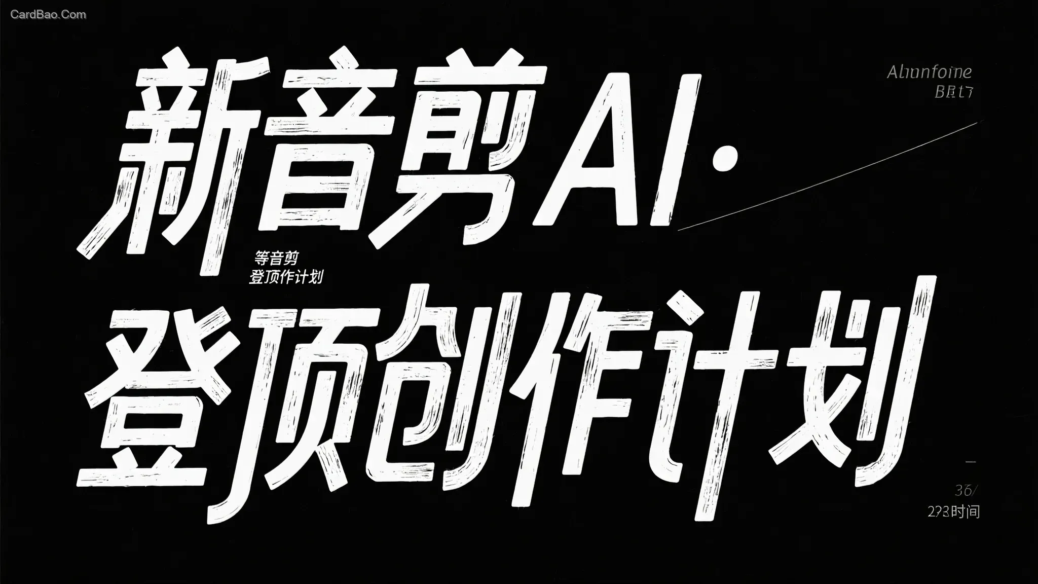等距排列,黑底白字,复古美术字“新音剪AI·登顶创作计划”,无衬线黑体字,有笔刷肌理感。