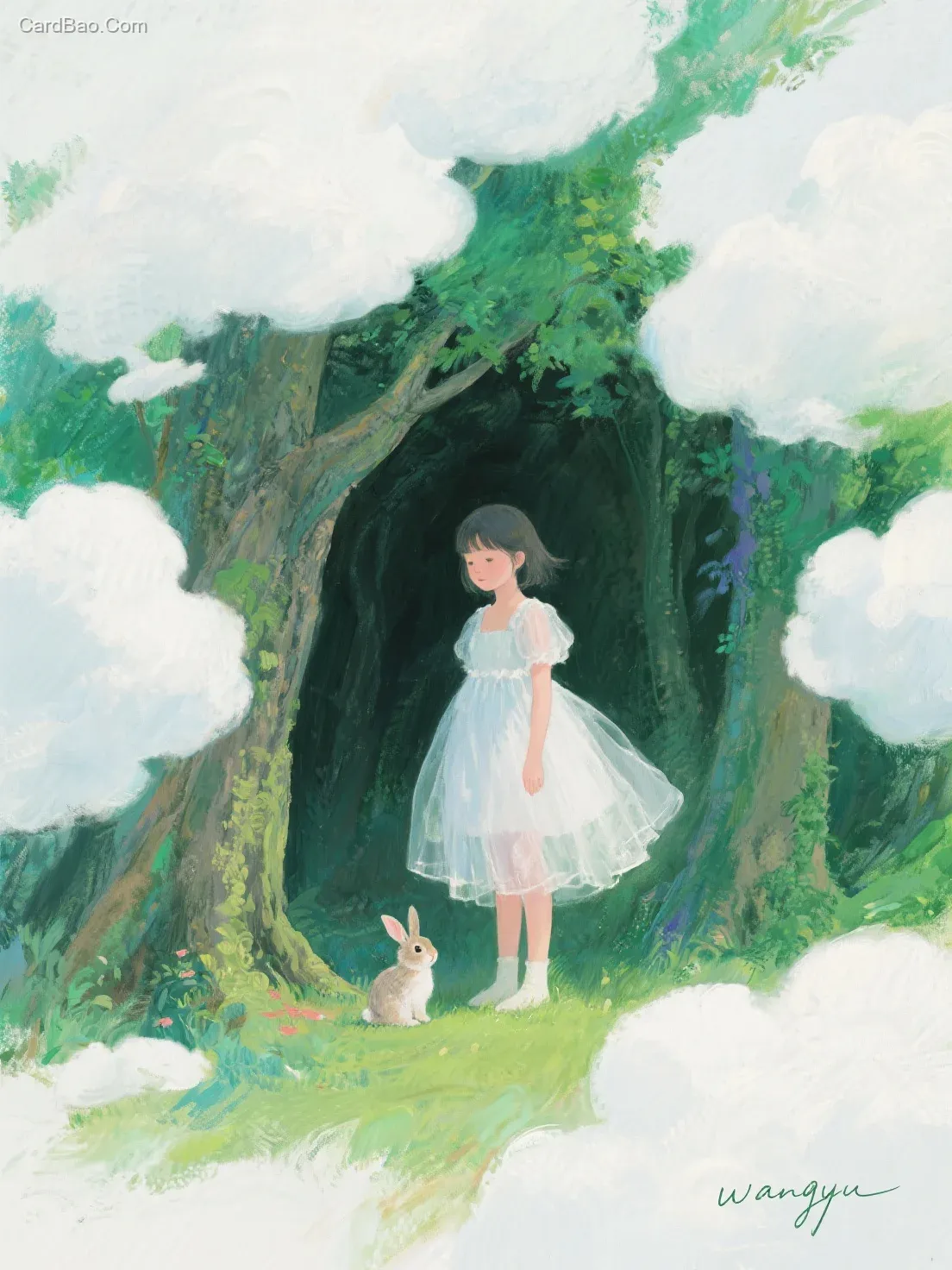 油画重彩,绿林树洞,色彩饱满,悠闲宁静,,小女孩,白云做的蓬纱裙,云朵,一只小小兔子,色彩晕染,笔触细腻,水墨渲染,右下角签名:wangyu
