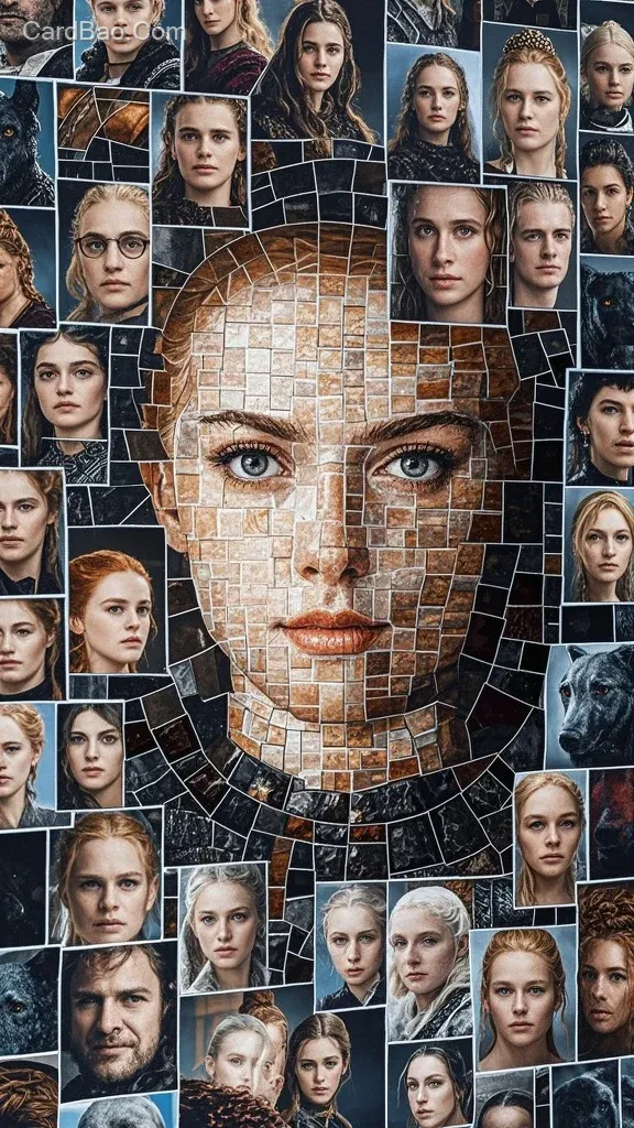 Create a hyper-realistic portrait composed of many small photos of several main characters from the TV series *Game of Thrones* (such as Sansa, the Hound, Brienne, etc.), all of the same size, arranged like a mosaic. Each small photo should be unique yet harmonize with the others to form a cohesive and visually striking image of Arya Stark. It is crucial that the colors of the small photos align to create a lifelike close-up portrait. In darker areas of the portrait, such as the eyebrows and shadows, use photos dominated by dark tones. For brighter areas, like the skin of the face, select photos with lighter tones. The final result should showcase maximum detail, emphasizing the texture and color of each individual photo while ensuring the overall composition forms a recognizable and impressive portrait. The style should blend realism with artistic interpretation, highlighting the intricate relationships between the individual images within the mosaic.