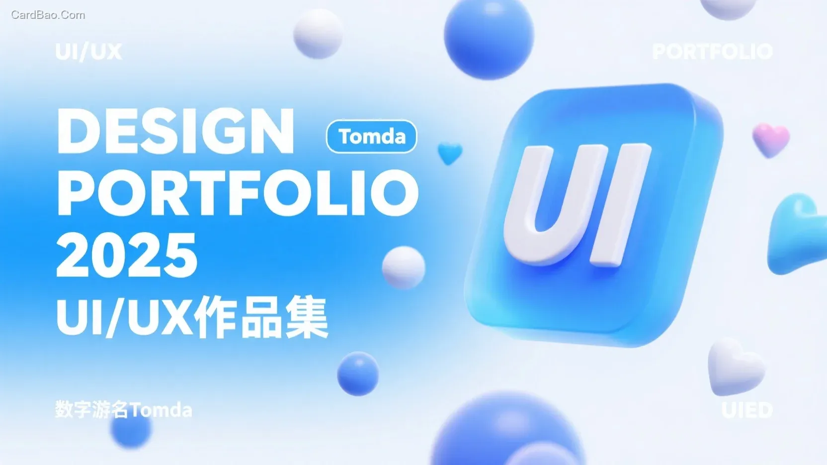 做一张UI作品集封面,右侧是一个3D的"UI"图标,整体3d渲染,作品标题“DESIGN PORTFOLIO 2025”以及“UI/UX作品集”以白色大字体呈现,在文字穿插一个标签设计“Tomda”,位于画面左边。背景是从浅蓝色渐变到白色的平滑过渡色调,散布着几个蓝色的抽象形状,如圆球和爱心,营造活泼氛围。左上角“UI/UX”左下角“数字游名Tomda” 右上角“PORTFOLIO”右下角“UIED”