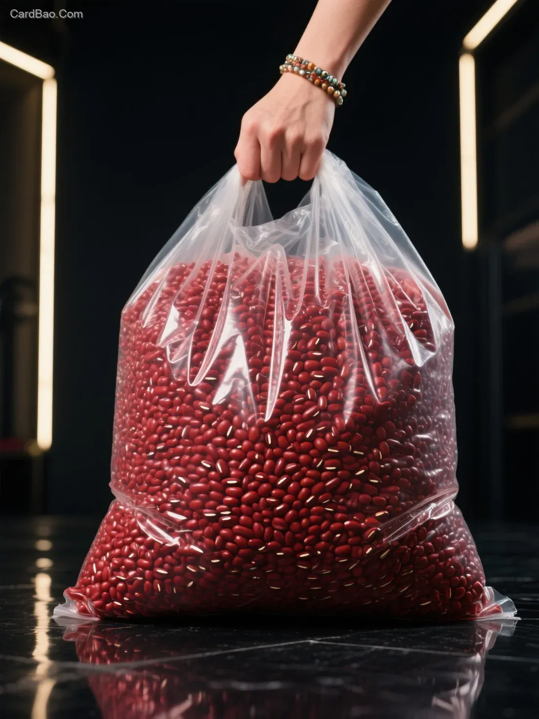 一只带着手链的好看的手拎着一个超肥超大的透明塑料袋,装的很满透明塑料袋被撑的圆鼓鼓的肥肥的,,看起来有,100斤,包装袋为高级透明亮材质,能清晰看到从上到底内部的红小豆,重点突出袋子饱满大大鼓鼓的,里面装满了红小豆,呈艳红色,表面润泽光泽。黑色反光地面,背景是深色的。可以隐约看到一下灯带,光线明亮,真实高清高融合。图片风格为写真,