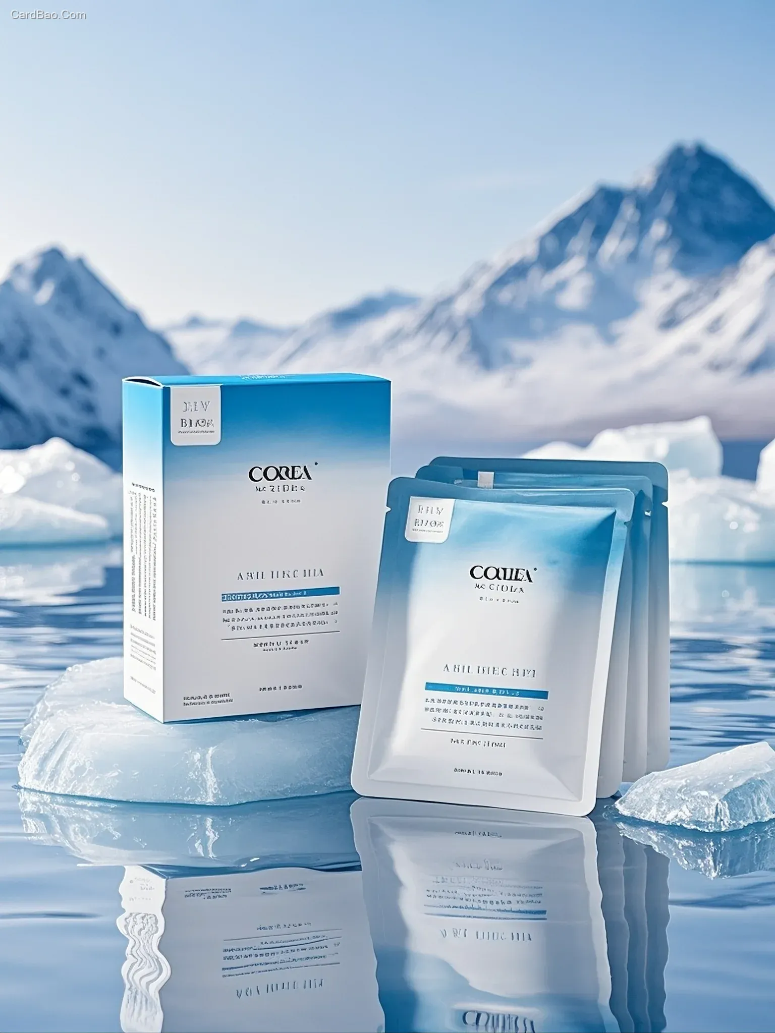 这张图片展示了一款蓝白色渐变的面膜,主要是展示这款面膜产品的拍摄。画面中既有产品包装盒,也有袋装的包装,产品站在冰川水上,倒影明显强烈,搭配模糊的冰川雪山背景,整体画面色彩柔和清新,整体是一种冰冷清凉的感觉,突出了产品的精致与高端。