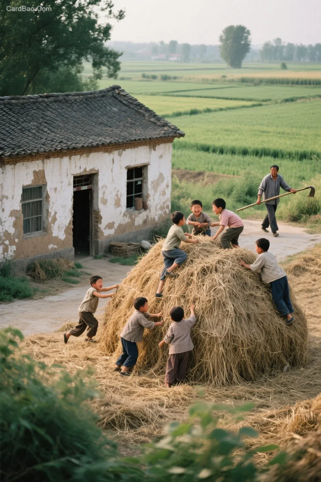 在宁静的农村,一座墙面斑驳的低矮平房静静伫立。平房前的道场里,堆着高高的草垛,宛如一个充满童趣的小天地。一群孩子在这里尽情嬉戏,有的在玩着充满乡土气息的游戏,欢笑声此起彼伏;有的身手敏捷地爬上草垛,仿佛探索着神秘的城堡。远处,广袤的农田绿意盎然,与眼前的场景构成一幅生机勃勃的乡村画卷。这时,一位壮年扛着农具,迈着坚实的步伐,从旁走过,给画面增添了质朴的劳作气息。