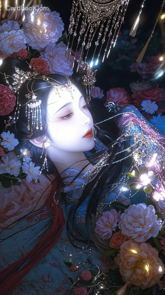 新三维古风,,奢靡颓废,荒诞美感,流苏饰品,中式光影,三维粒子,,生物发光,暗夜微光,,8K超清,惊艳,美人,花,五官精致,中式留白美学,氛围感,高级感,华丽光影,明暗对比强烈