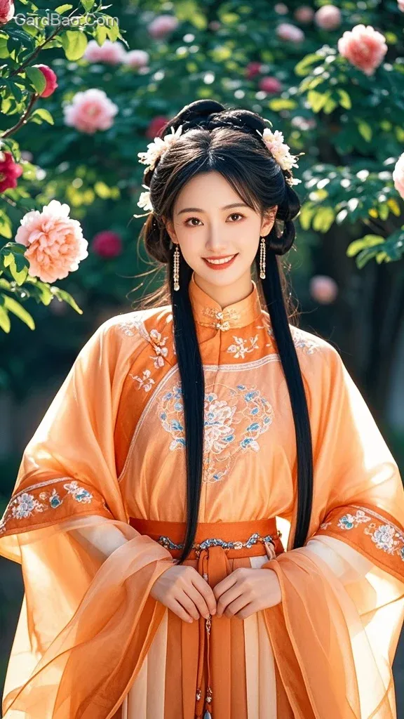 帮我生成写真,全身正面站着照片,古装美女,微笑,长发发饰,长流苏,长耳坠,浓眉大眼,皮肤白皙,长睫毛,丝绸面料橘黄色绣花掐腰衣服,掐腰衣服,橘黄色丝绸绣花大摆长裙,立领双盘扣,长袖,背景虚化绿树叶,阳光,牡丹花,高清,电影质感。