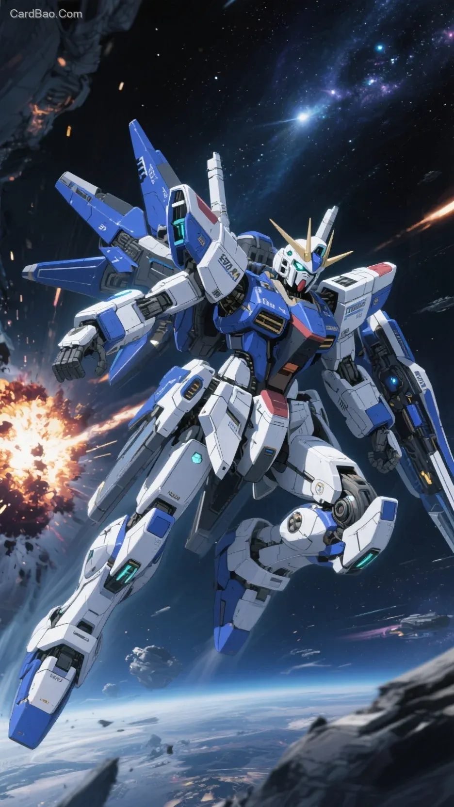强袭高达在宇宙战场中高速飞行,机甲细节精致,蓝白金属装甲在星光下闪耀,展现出动态战斗姿态,背景是浩瀚星空和爆炸特效,渲染出科幻英雄氛围,风格是科幻动漫风格,超精细机械结构刻画,冷色调金属质感。超详细,复杂细节,战锤哥特风格,暗黑机械美学,工业级细节,电影级照明,8K分辨率。