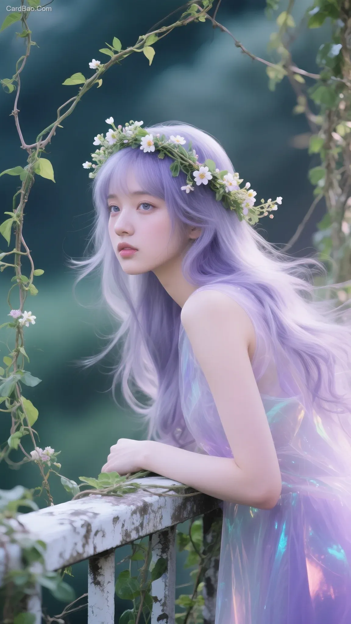 A beautiful lifelike girl with a crown of intertwined vines and small flowers, long flowing silver-purple hair, and narrow, sparkling eyes, leans against a mottled railing. Vines sprawl around her, lush and full of life, in a surrealist style. Her profile is depicted in a realistic manner, with a translucent, ethereal quality. The image exudes sophistication, a sense of transparency, luminous highlights, soft gradients, high definition, and rich detail.