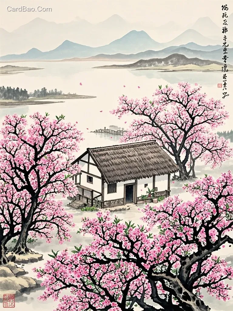 Peach Blossom Island, an island covered with blooming peach trees, where a thatched cottage stands amidst the sea of flowers. The scene should be highly realistic, captured from an aerial perspective, in 64K ultra-high-definition resolution.