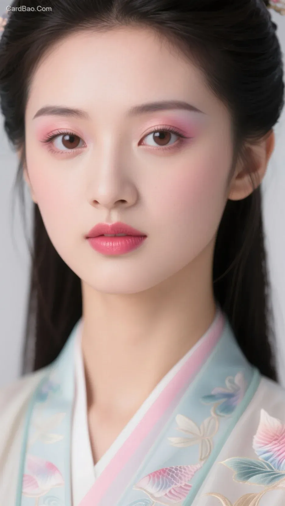 8K resolution, ultra-high definition, pixel-perfect, ultra-fine details, exquisite facial features, well-proportioned, large eyes, clear, image, ultra-clear, refined image, eyebrow makeup, eyebrows, eye makeup, elegant eyeshadow colors, mermaid-inspired, lip makeup, subtle, pink, bold lip makeup, dewy lips, natural, gentle, contouring, blush, translucent, elegant, wallpaper, ultra-clear, masterpiece, 16K, high-speed HD, detailed, highly artistic, Chinese style, distant camera, shooting, studio, master photography, Eastern beauty, facial close-up, panoramic view, studio, light sensitivity, modern style, ancient style,