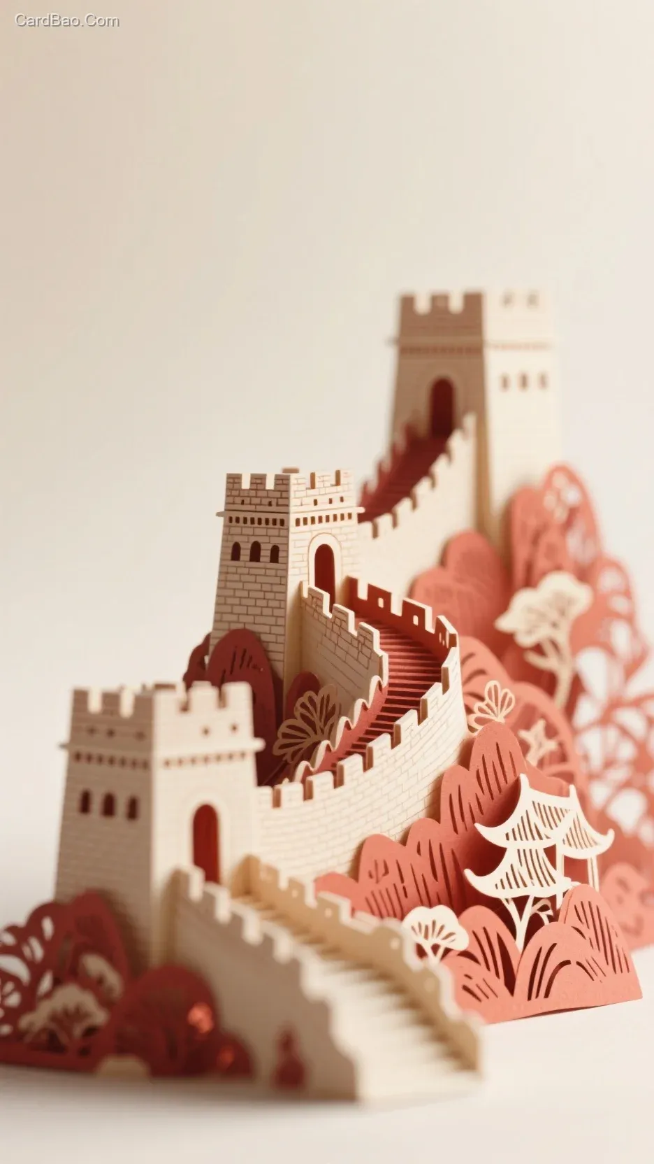 以微缩摄影手法呈现具有中国剪纸艺术风格的立体的巍峨长城建筑,展现传统风格与非遗特色,剪纸细腻精美,仿若纸艺镌奇。画面为天风景,背景是纯净的米白色,突出光影效果,营造独特氛围
