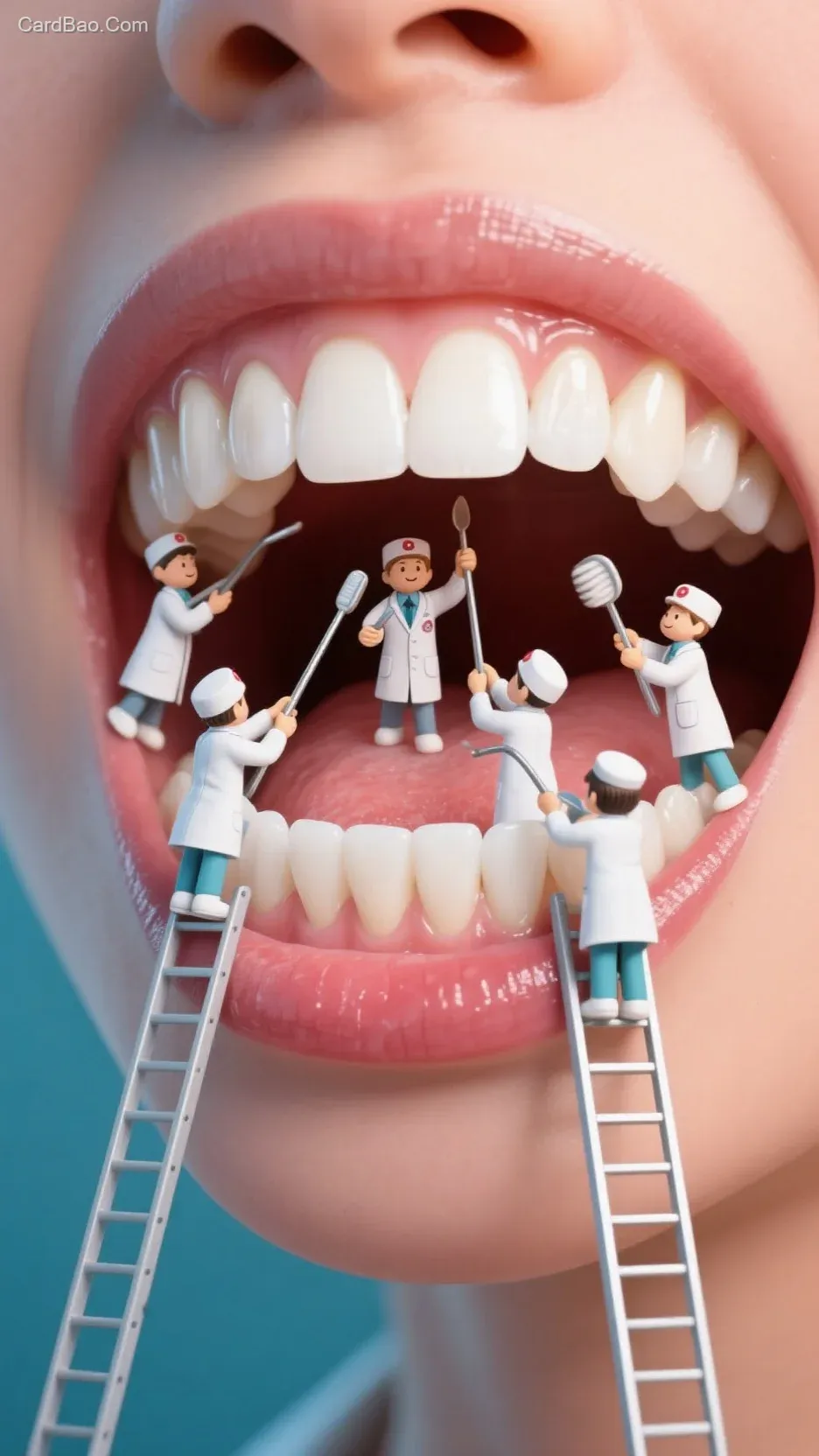 一张巨大的嘴,两排洁白的牙齿,几个穿着医生衣服的小小牙科医生全部在嘴巴里面拿着工具清理牙齿,相对于几个医生来说,每一颗牙齿都是巨大的,医生需要借助梯子或者其他工具才能进行清理。