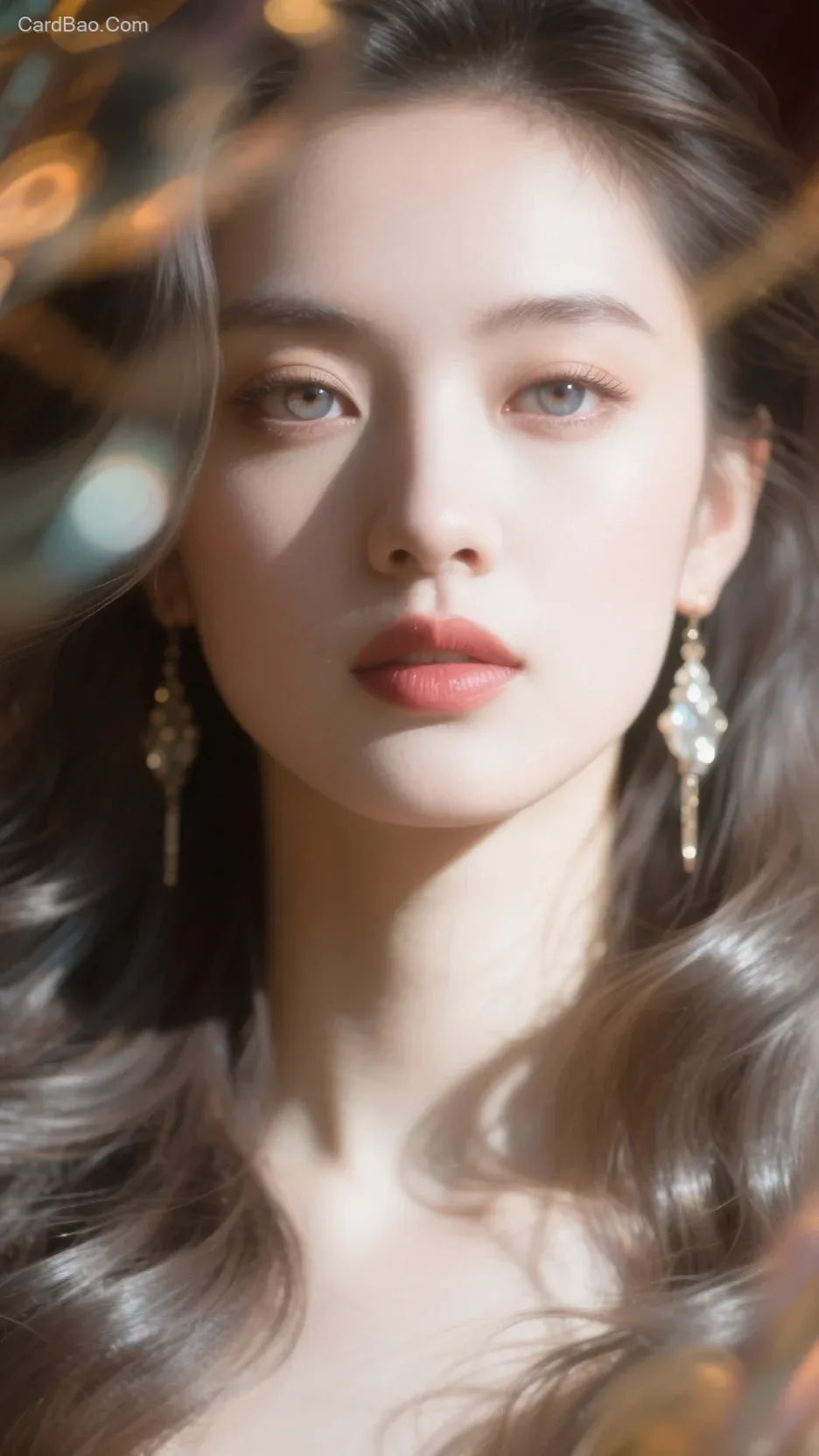 绝世美颜,细腻,暖色调,自然光,孟菲斯风格背景,怪诞,梦幻氛围,微妙发光,强烈明暗对比,渐变光影,轻微模糊,高清晰度,复杂细节,超高清,高级感,最高画质,耳坠,写实逼真,细腻肌理,强侧光,高曝,过曝,伦勃朗光,强烈明暗对比,真实皮肤质感,高细节,8K分辨率,电影级光影,锐利焦点,柔和渐变色调,洁白无瑕的肌肤,冷白皮,眉毛细长秀气,雪白透亮肌肤泛着光泽,柔和暖光营造幻想,沉醉氛围,水汪汪的眼睛,眼神坚定柔美,灵动,嘴唇丰润,羞涩,32K高清,全局朦胧模糊,抽象,狂乱,妩媚,失控,动态模糊,边缘模糊,多重曝光,失焦,景深,动态美学,弥散晕染,朦胧美学,夸张构图,杰作,高清渲染,脸部清晰,细腻画质,明暗对比,艳丽的油画质感超高清,最高画质,面部聚焦,朦胧感,高级感,垂坠感,奢华氛围,发型光,发丝光,发丝分层,发质光泽,细腻反光,棕灰色长卷发,发丝金属光泽油亮,肌肤细嫩光滑,白哲细致入微,闪亮,闪耀,棕色眼曈,双手抚脸,垂眸,低笑,齐平指甲,前景周围有许许多多点点光斑漂飞,闪闪发光,时尚简约服式,大长腿,漫画