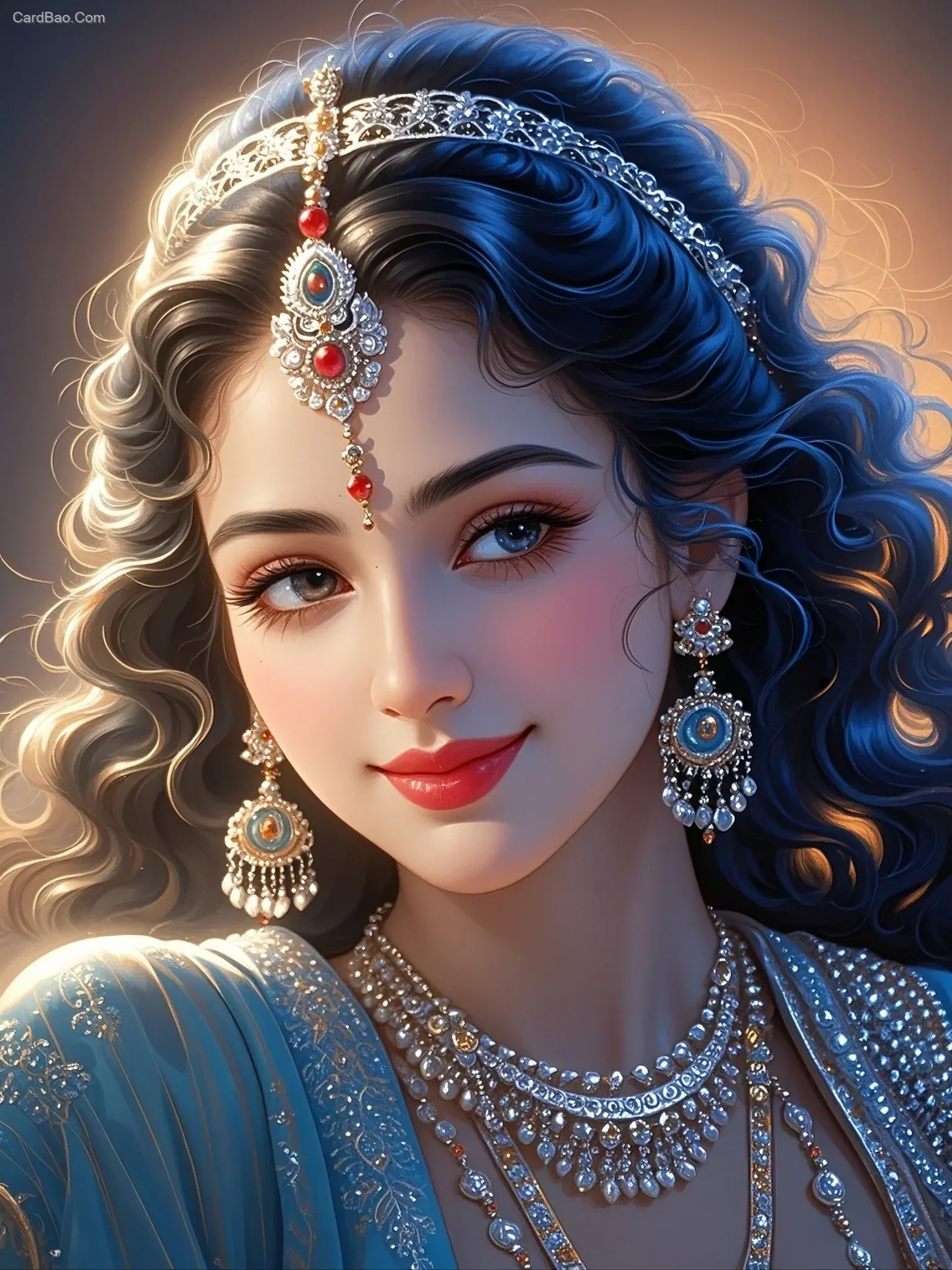 Exquisite, gentle and elegant, romantic ancient Indian style, portrait of a beautiful woman, looking down with a soft smile, adorned in traditional ancient Indian attire, sharp eyes, rosy cheeks, elegant clothing, intricate silver threads, fair and smooth skin, slender and graceful figure. Oval face with delicate and three-dimensional features. Large, clear and bright eyes, long and fine eyelashes, naturally soft eyebrows, a straight nose bridge, pink lips, a calm and gentle expression, and an elegant posture. Skin is delicate and smooth, with subtle and fresh makeup that highlights natural beauty. An ethereal atmosphere, skillfully capturing emotion, a masterpiece, soft tones, high resolution, depth-of-field composition, 32K ultra-high definition, blue-ray quality. 3D effect. Oil painting style.