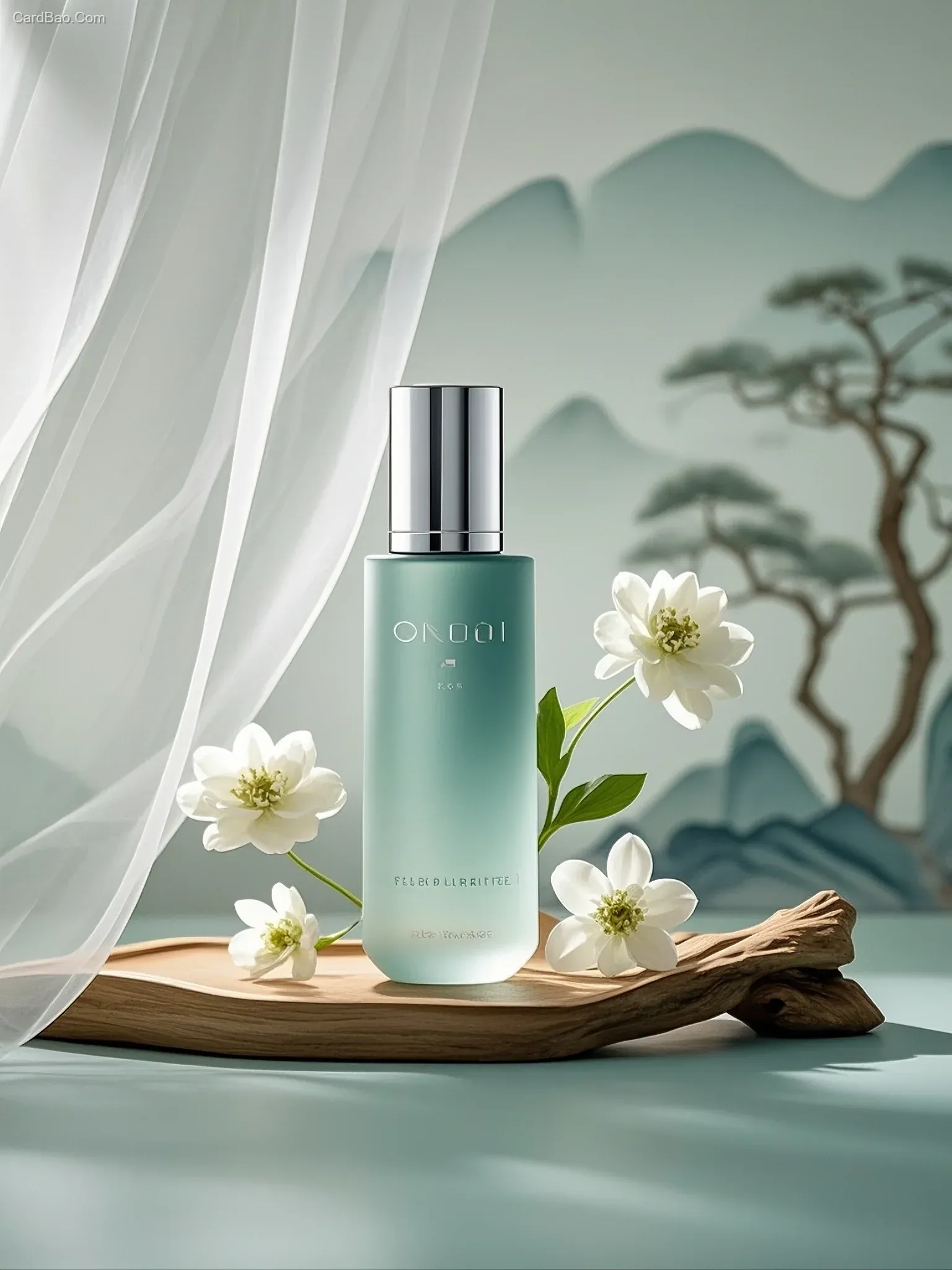 主体是一瓶淡青色磨砂质感的精华水,周围散落着两朵白色的小花,背后模糊的纱帐上画着山水画,整体是新中式的淡雅风格,整体调性是淡青色的,超强质感,超真实质感,超强品质感,大牌质感调性,大面积留白,居中构图,4K