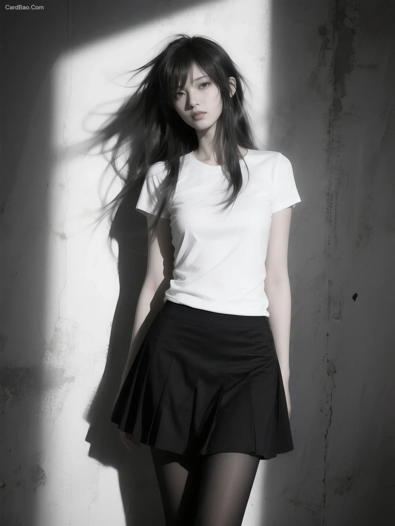 身穿黑丝短裙,白色体恤,亮朦,隐约的淡彩,蓝色褪色,逆朦,过曝,泛朦,柔焦,特写,最终幻想尤娜的模糊人像,动态发丝凌乱美,超高颜值,女神风,复古,低饱和,强侧光,反射,泛光,高反差,墙壁长阴影,质感肌理,身材曼妙,洁白无暇的皮肤,泛光模糊晕染,高噪点,胶片质感,极简风,柔焦灰度美学,逆光朦胧美学,情景写意,前卫视觉艺术美学,高级感,电影大片美学,获奖作品,大师杰作。