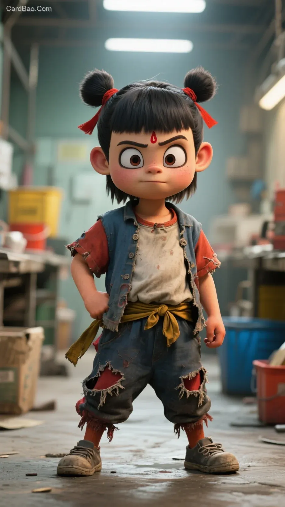 The mischievous Nezha, who excels at working hard, puts on the worn-out clothes of a laborer.