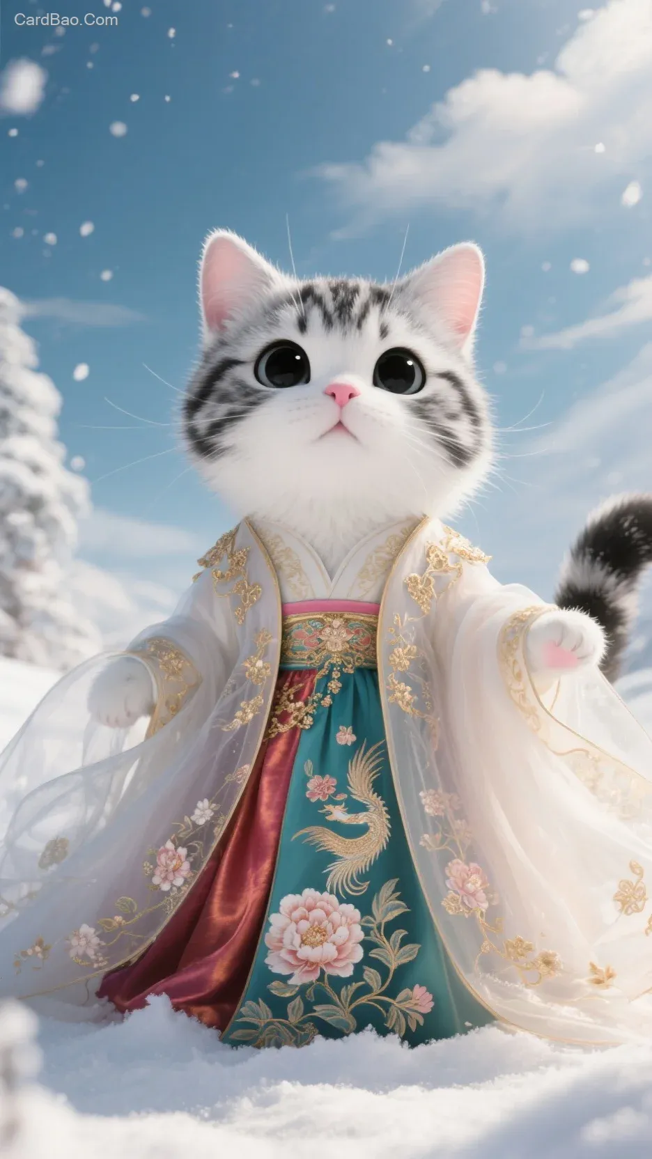 The anthropomorphic American Shorthair Calico cat is dressed in an elaborate ancient princess outfit, with materials that look incredibly realistic. The outer layer of sheer fabric is as light and transparent as mist, embroidered with intricate golden patterns of blooming peonies and soaring phoenixes. The embroidery is delicate and lifelike, with every stitch clearly visible. The inner layer of satin is vibrant and rich in color, fitting the cat’s form snugly and making it appear even more charming. The collar and cuffs are adorned with a fringe of pure white fur, complementing its own coat and adding to its noble and luxurious appearance.