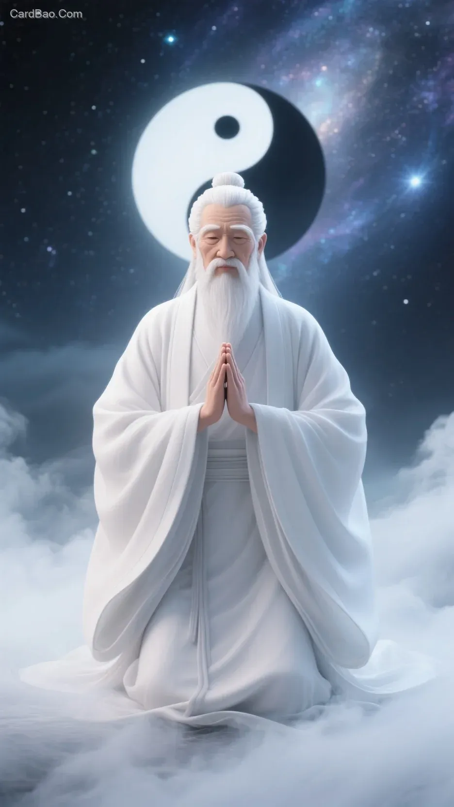 An elderly Taoist with white hair and a youthful complexion, sporting a long white beard, is dressed in a wide-sleeved white Taoist robe. He exudes an ethereal, immortal aura, with a refined and elegant appearance that fully embodies the demeanor of an immortal. Misty clouds swirl around him, and behind him is a symbolic yin-yang Taiji diagram representing auspiciousness. He is respectfully kneeling down. The image is presented in a front-facing 3D anime style, set against a dreamy, galactic background.