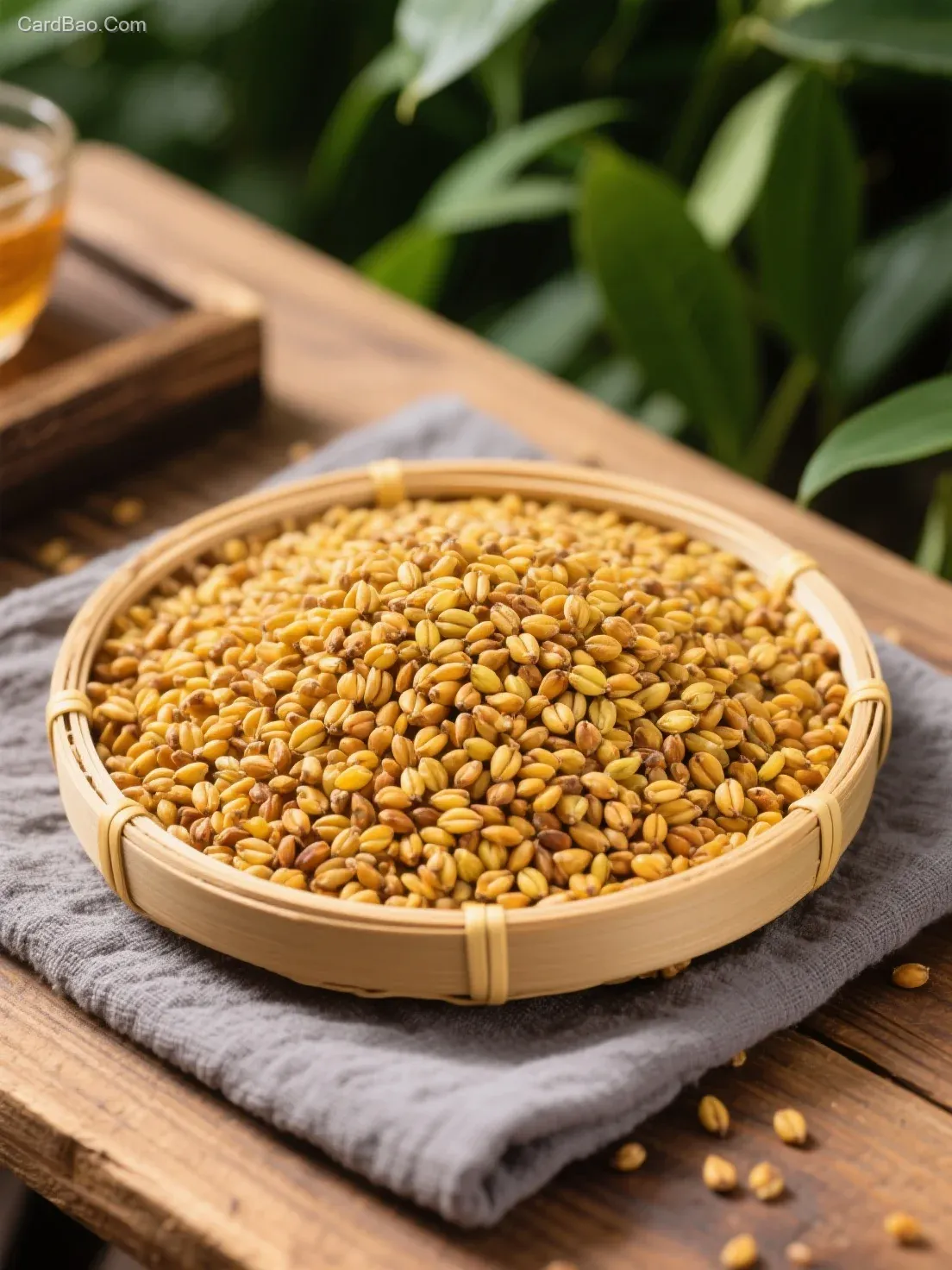 Wooden table, complete bamboo-woven round tray filled with golden tartary buckwheat, plump and abundant buckwheat tea grains, overflowing with a rich golden hue that looks very appetizing, gray cloth, highlighting the generous portion of tartary buckwheat with green plants in the background.