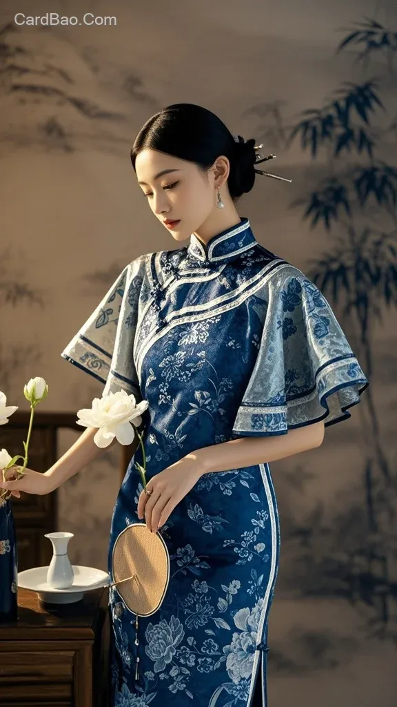 青花瓷纹旗袍,高立领荷叶袖,靛蓝真丝缎,白釉盘扣,青花滚边,水墨感背景,中国风