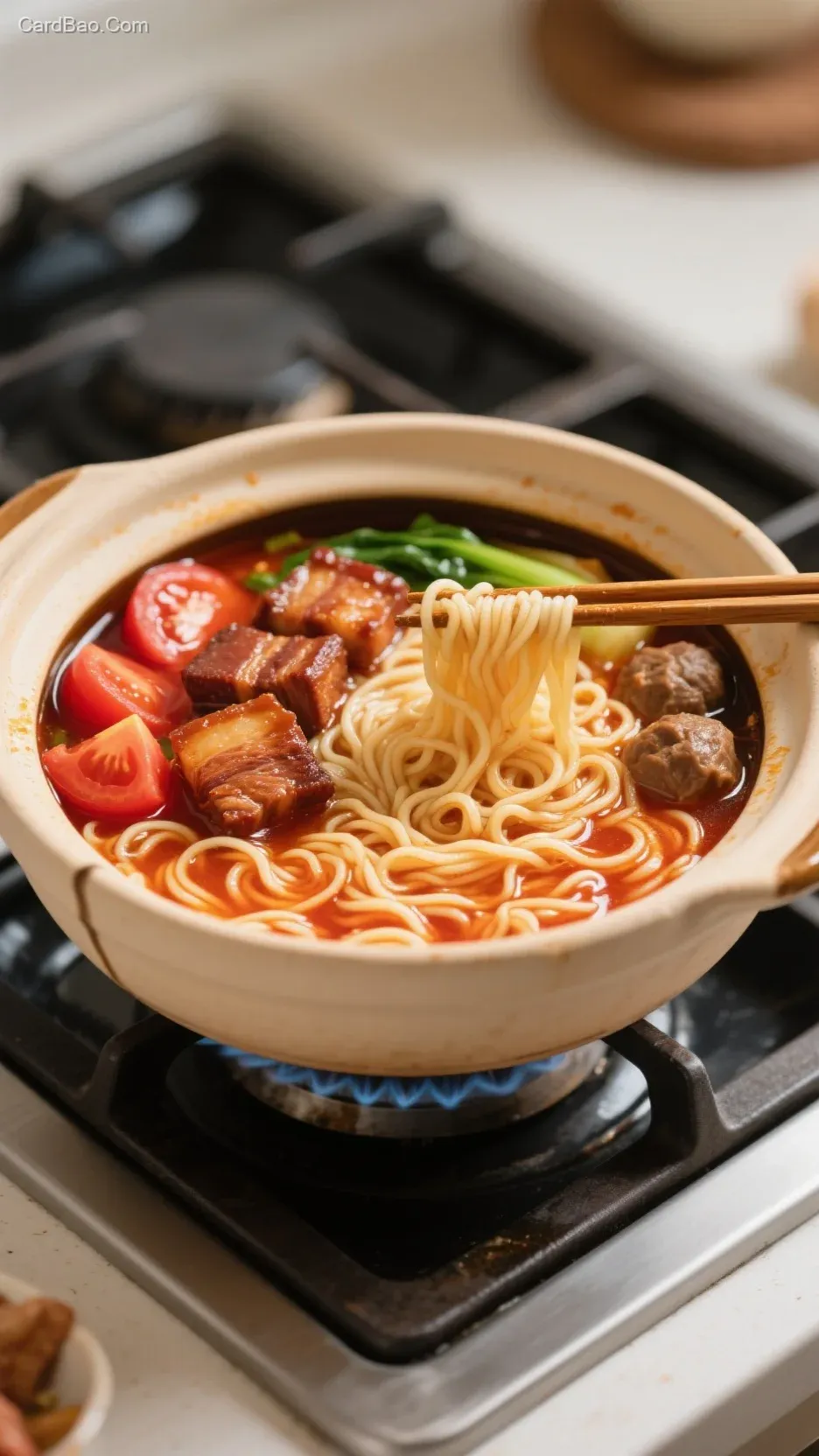 画面中央,一个陶瓷锅放置在炉灶上,锅里的水翻滚着,里面的面条根根分明,富有弹性。锅内的泡面搭配丰富,汤汁呈现出浓郁的红色,看起来鲜香可口。
