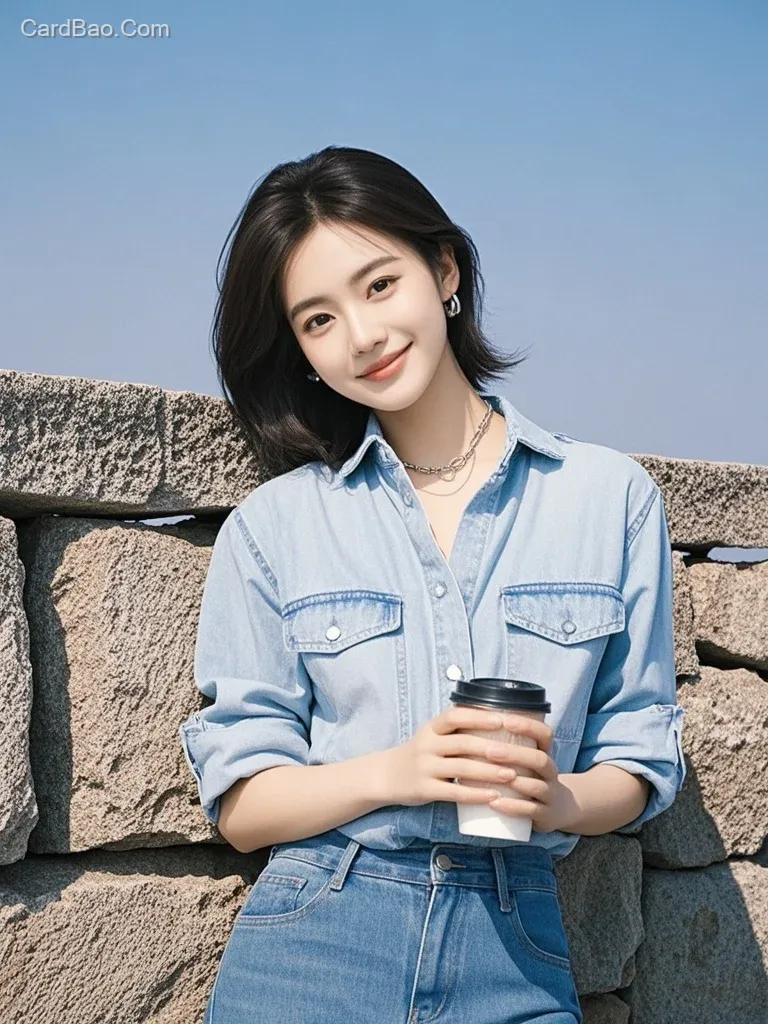 The woman in the picture is wearing a light blue denim shirt and jeans, holding a coffee cup, leaning against a stone wall with a gentle smile. Her overall look is casual and relaxed, conveying a comfortable and carefree atmosphere.