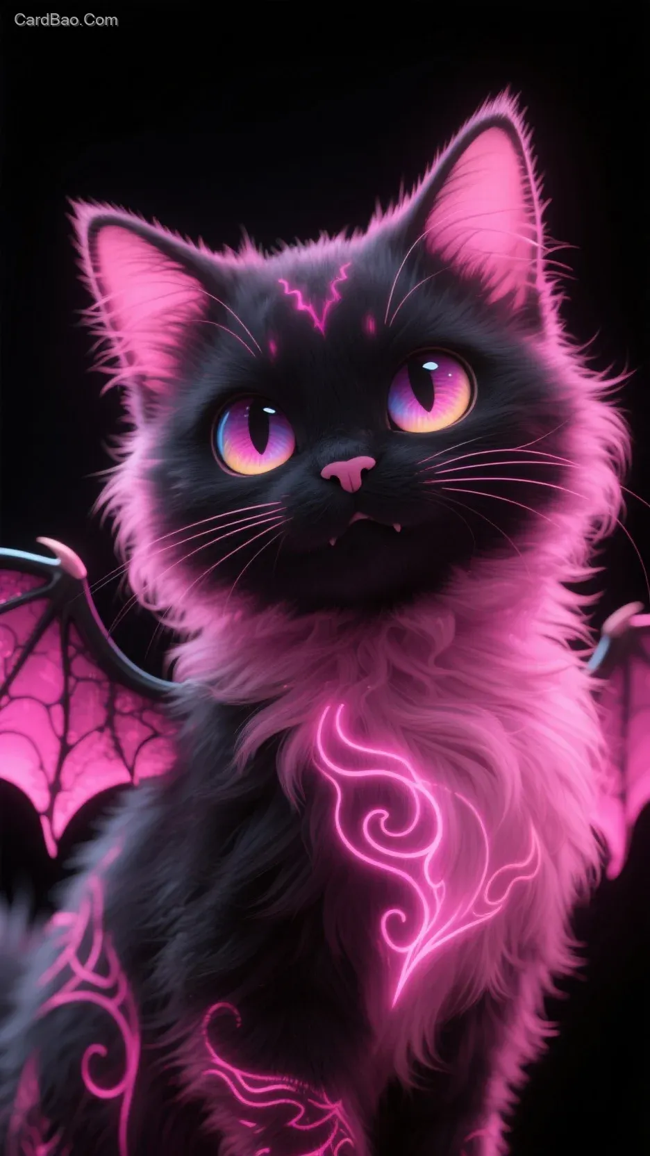 Close-up of a kitten's face, with pink glowing demonic black wings, body adorned with enchanting pink magical patterns and glowing fur. Shot from an extremely close range with subdued lighting, rendered using OC rendering and Unreal physics engine. The demon cat is acting coquettish and cute, with fluffy and soft fur, its head leaning close to the lens. Features 3D detailed modeling, anime-style, dreamy aesthetics, facial close-up, dreamcore theme, ultra-macro capture, front half of the body, frontal view, set in a completely dark environment with a pure black background. The kitten has long fur, multiple exposures, and multiple dynamic images, creating a comfortable vibe. Its gradient-colored pupils are glowing.