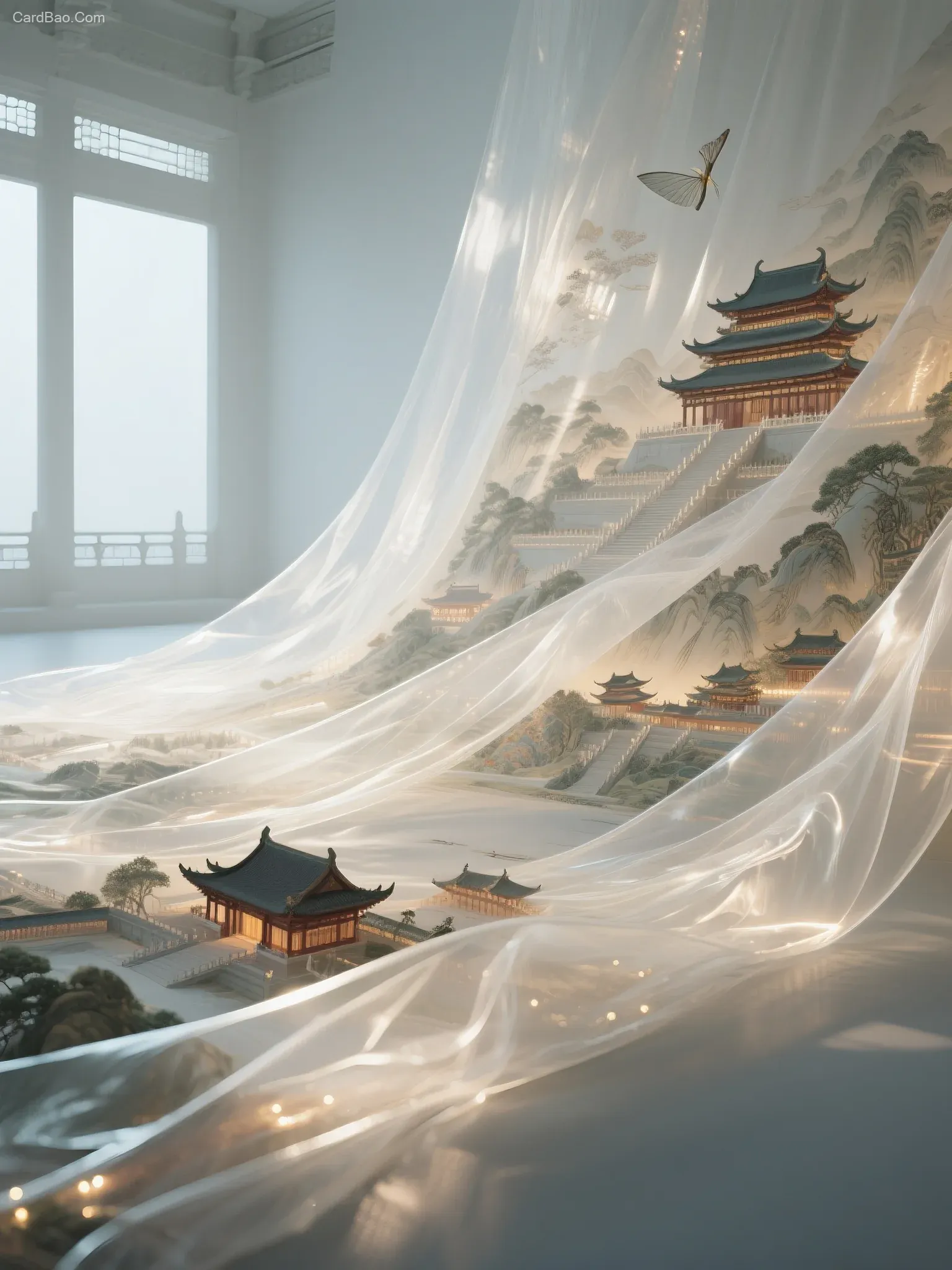 超现实主义,明亮的的空间,潜在空中的丝绸,透明的丝绸,逆光,丝绸上的阿房宫真实景观画卷缓缓展开,发光,飘动,迷幻的,电子光学,传统艺术,东方神秘感,诡异,唯美,寂静。薄如蝉翼,艺术化极简