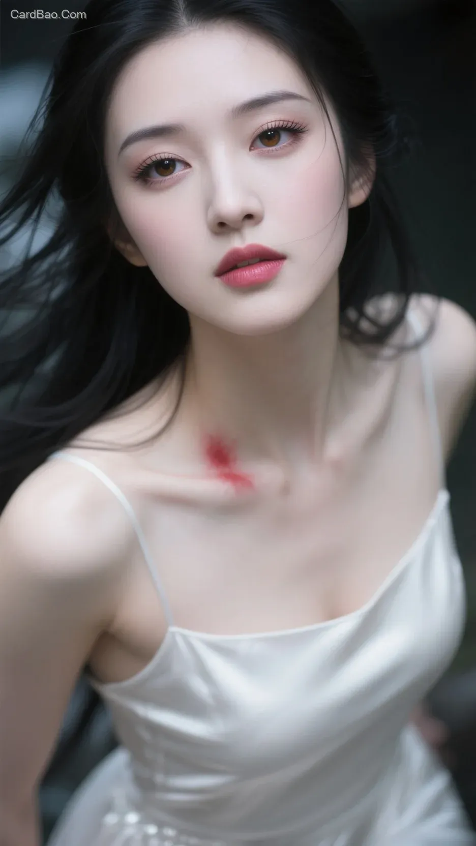 超级写真,绝色美人,微距摄影,人物俯视镜头。瓜子脸,柳叶眉。脸颊略带红晕。勾魂摄魄的眼睛,丹凤眼,桃花眼,水灵灵媚眼,眼尾细长上扬。黑色眼瞳,琥珀巩膜。瞳孔清澈透光,水润虹膜纹理。眼神深邃。眼泛波光,神光离合。长长的真实睫毛。柔和挺直的鼻梁,小巧漂亮的鼻子。粉嫩红唇,饱满丰润,嘴角微微上扬,翘嘴唇,嘴唇微张,欲说还休。自然唇纹间泛着细腻的湿润光泽,透明唇釉泛着晶莹的光泽,浅粉色晕染自然溢出唇线,柔和的光影呈现立体的唇纹反光。用微距镜头捕捉眼睛和唇部表面透明薄膜质感。略微凌乱的黑色长发,被风吹乱的发丝,发丝睫毛眉毛细腻刻画。陶瓷白珍珠肌肤,皮肤纹理精细,8K毛孔细节,细碎汗毛泛光。