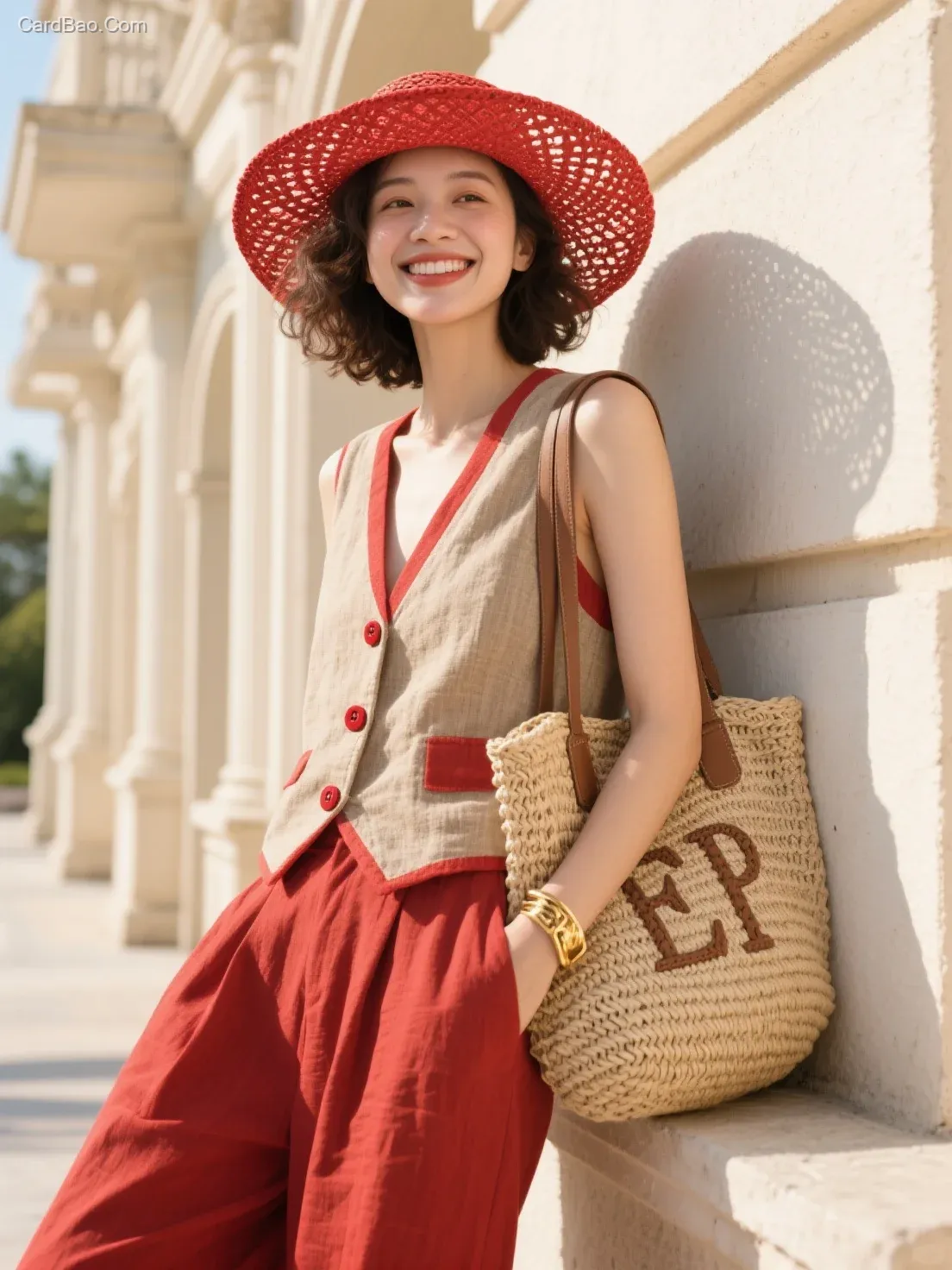 阳光洒落欧式建筑间,女子笑意盈盈。她头戴红色镂空草帽,微卷中短发。亚麻材质麻红色v领马甲,搭配红色系阔腿裤下装,,红色棕色纽扣,腕间金色手镯点缀精致。身背卡其色大容量编织包,包身字母元素增添时尚感,背靠在墙面。整体散发着随性又优雅的度假气息。