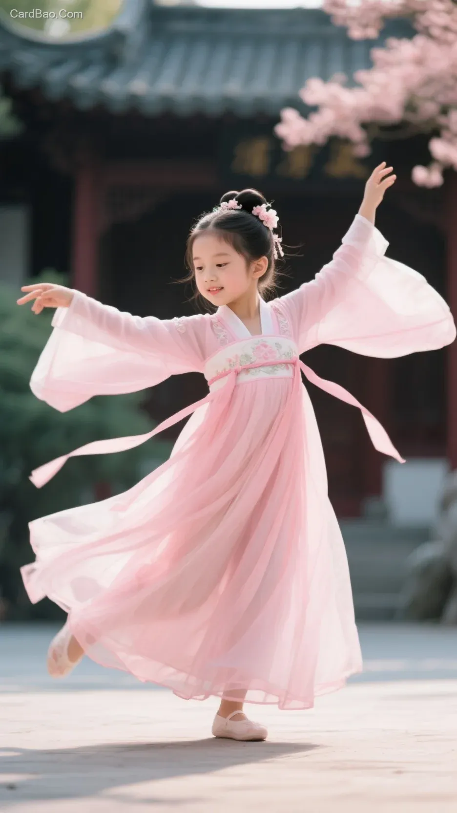 一个身着粉色汉服的现代风格小女孩,身姿轻盈地翩翩起舞,每一个动作都充满灵动之美