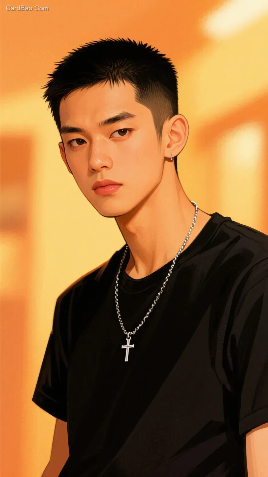 Thickly painted illustration style, featuring a 20-year-old Chinese male with a Korean-inspired look, sporting a natural black buzz cut. He is wearing a black T-shirt, with sharp and cold eyes, and a silver necklace with a cross pendant around his neck. The background is a blurred warm tone, creating a soft atmosphere.