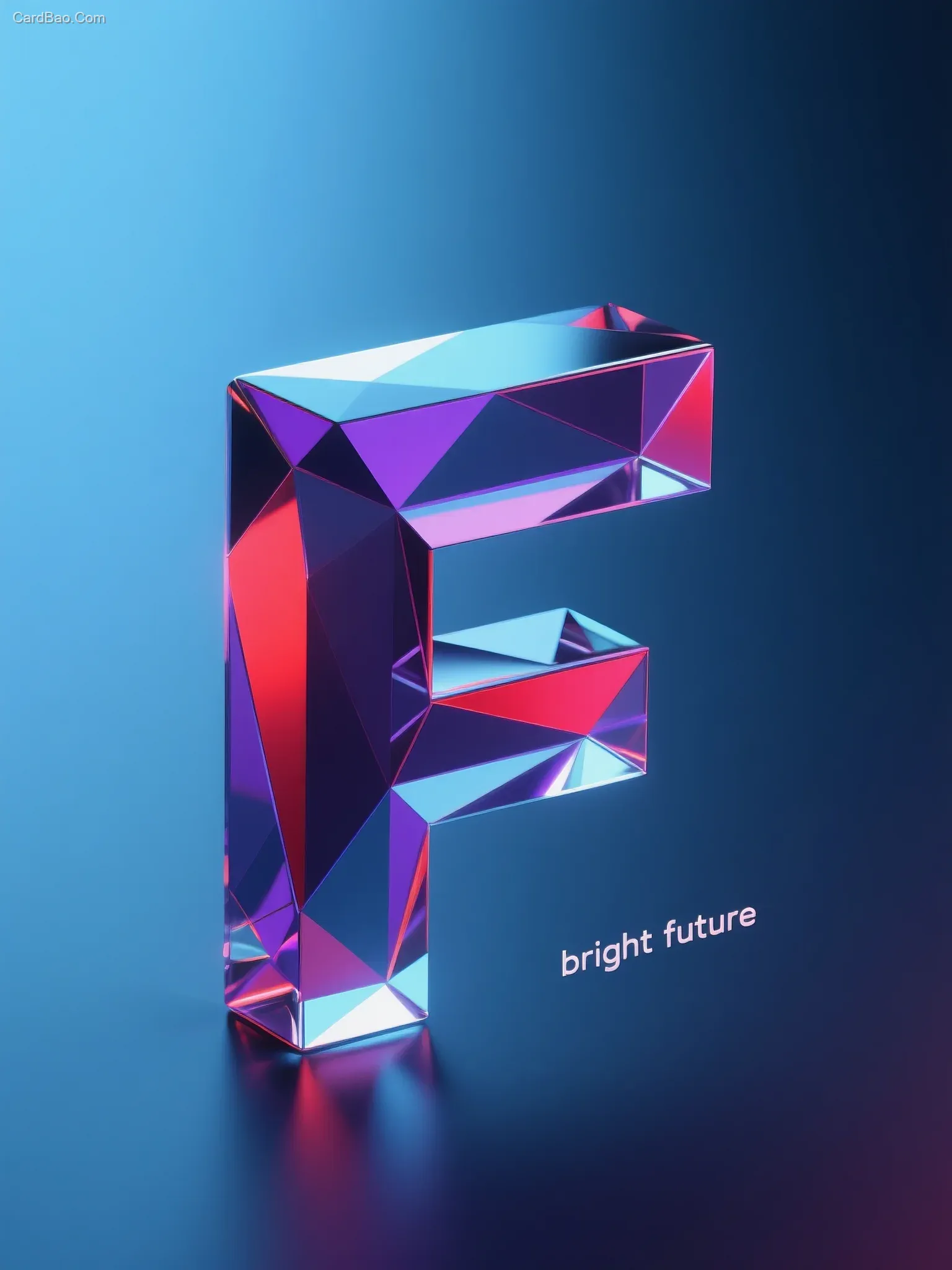 This is a futuristic and tech-inspired digital artwork. The composition employs a dark color palette, blending deep blues, mysterious purples, and vibrant reds—cool and warm tones with high contrast—against a solid background to create a striking visual impact. At the center stands a three-dimensional polygonal "F" constructed from numerous geometric shapes, with the tiny phrase "bright future" in the lower right corner. The material exhibits a smooth, mirror-like glass texture that reflects dazzling light, hinting at the precision and advancement of high technology.