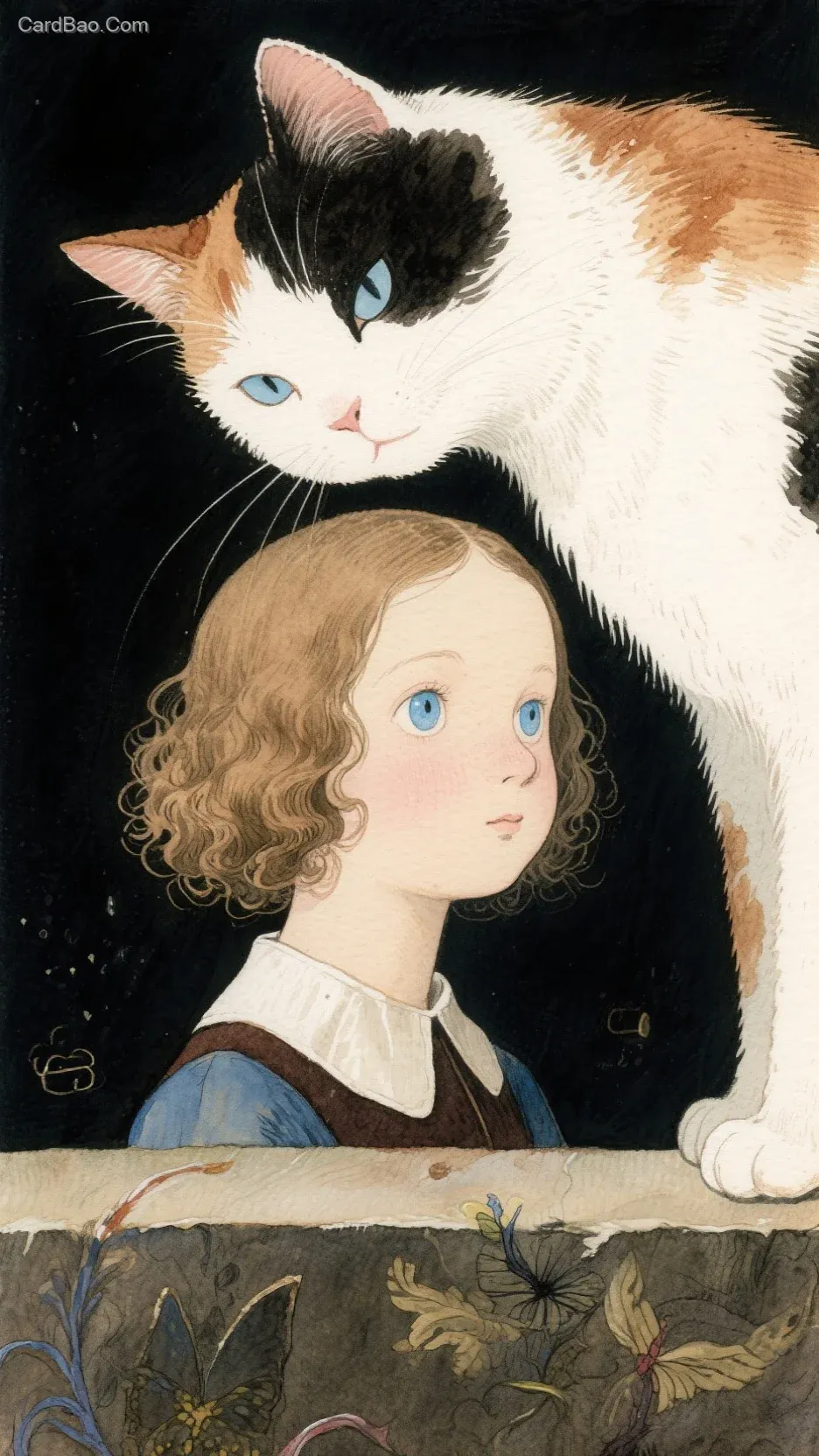 广角畸变,尾田荣一郎风格插画,卷头发的外国小女孩,淡蓝色的眼眸,,女孩衣领以上大头照,三花猫伸出脑袋遮挡住女孩的半张脸,女孩和纯色猫都展示侧脸, ,整体颜色暗淡,颜色淡