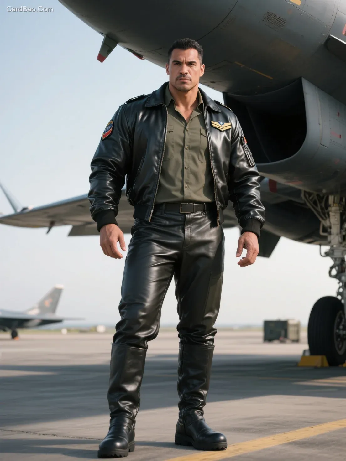 High-definition CG, a handsome and dashing Eurasian captain, a sexy middle-aged man wearing a leather uniform jacket paired with a shirt, loose straight-leg boots, standing under a plane on a quiet tarmac. He is tall and imposing, with a large, robust build, broad-shouldered and strong-legged, standing 195 cm tall, weighing 250 pounds, with size 45 feet—the type who frequents the gym. High contrast, low saturation, realistic.