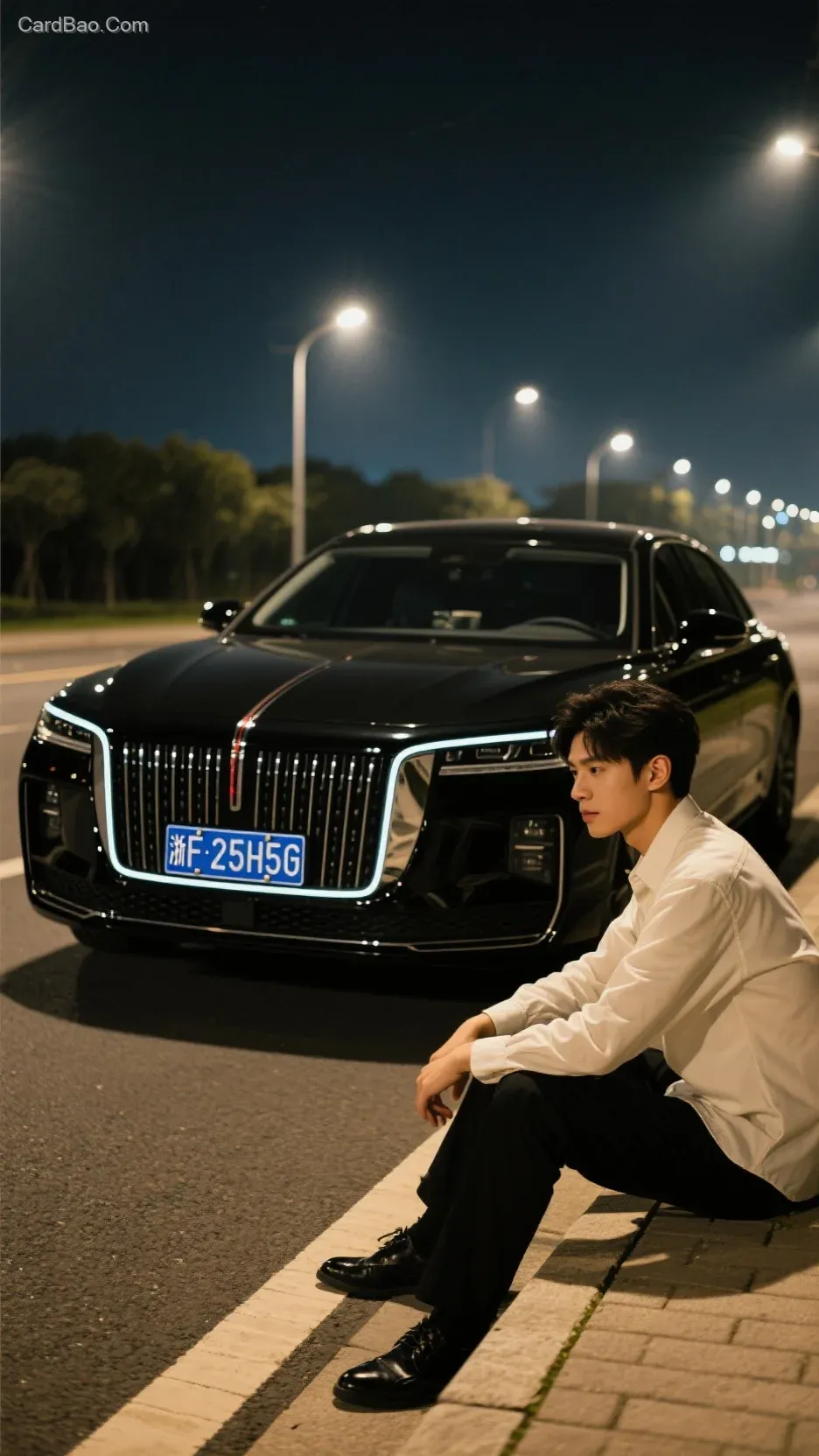 A handsome guy is sitting on the curb by the roadside, with a black 2025 Hongqi H9 parked beside him. The license plate reads ZheF25H5G. Under the dim streetlights, he looks downcast and seems to have something on his mind.