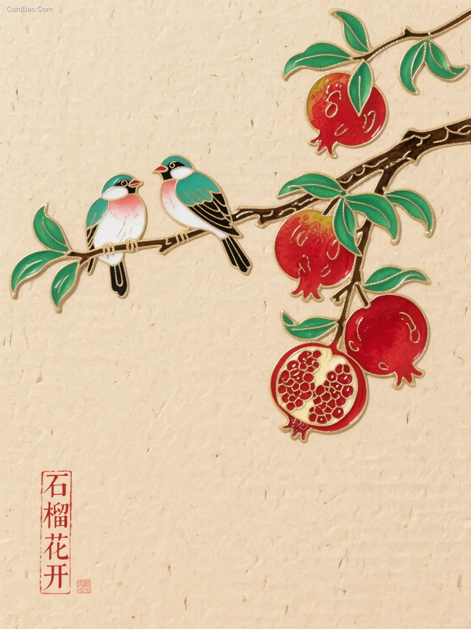 珐琅工艺画,正交视角,两只小鸟落枝头,四个石榴从右上角垂下,纸板颗粒背景,极简风格,左下角落款“石榴花开”小篆体竖版红印
