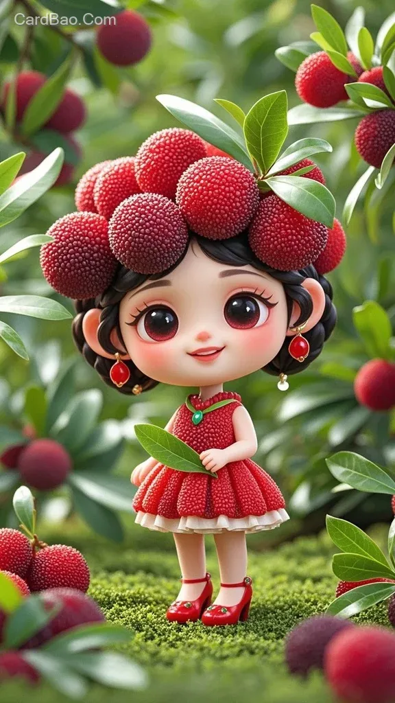 In the lush and verdant orchard, a playful and personified bayberry spirit comes to life with vibrant energy. She is petite in stature, with a round face that resembles a perfectly ripe bayberry. Her large, clear eyes shine like black gemstones, and her sweet smile radiates an irresistible charm. Her hair is composed of plump, glossy, and richly colored ripe bayberries, with fresh green bayberry leaves scattered playfully throughout. She wears a dress pieced together from bayberries, adorned with emerald green leaves. On her feet are elegant high heels in shades of bayberry, while delicate bayberry-colored gemstone earrings and a matching thin necklace complement her look. A close-up highlights both her adorable features and the enticing texture of the bayberries.
